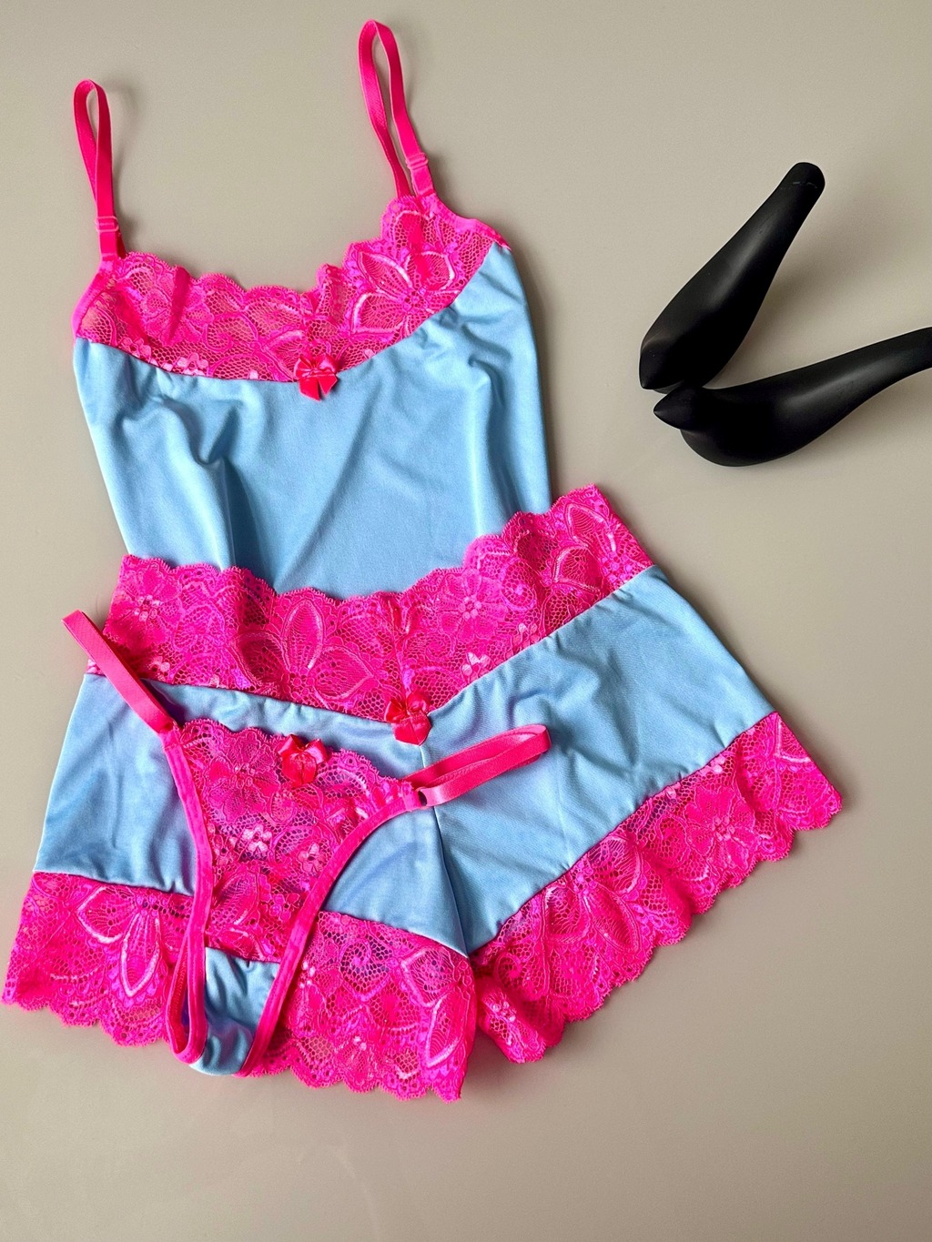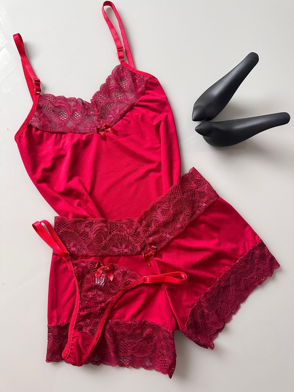 O Conjunto Babydoll é confeccionado em tecido romantique com detalhes em renda, sem bojo, permitindo um caimento leve e delicado.